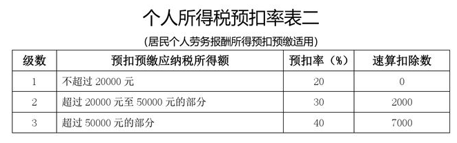 勞務(wù)報(bào)酬所得適用20%至40%的超額累進(jìn)預(yù)扣率(見(jiàn)《個(gè)人所得稅預(yù)扣率表二》)。